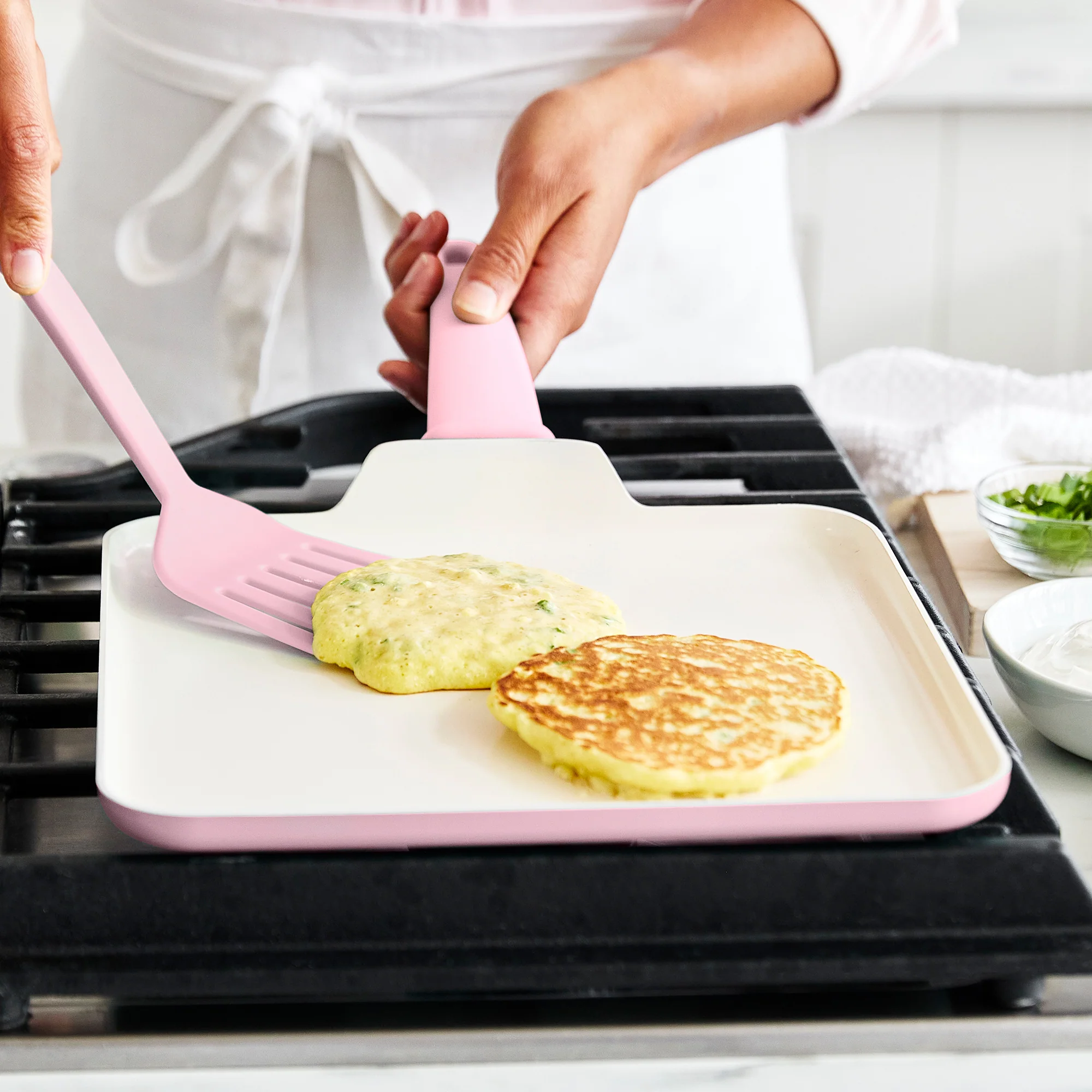 Restaurants use flat top griddles to make all the food you love. Check out all that space. Four burgers at once? No problem. All that extra room and low sides means it almost can’t be crowded. You get easy fried eggs, effortless steaks, and the easiest pancakes you’ve ever flipped.